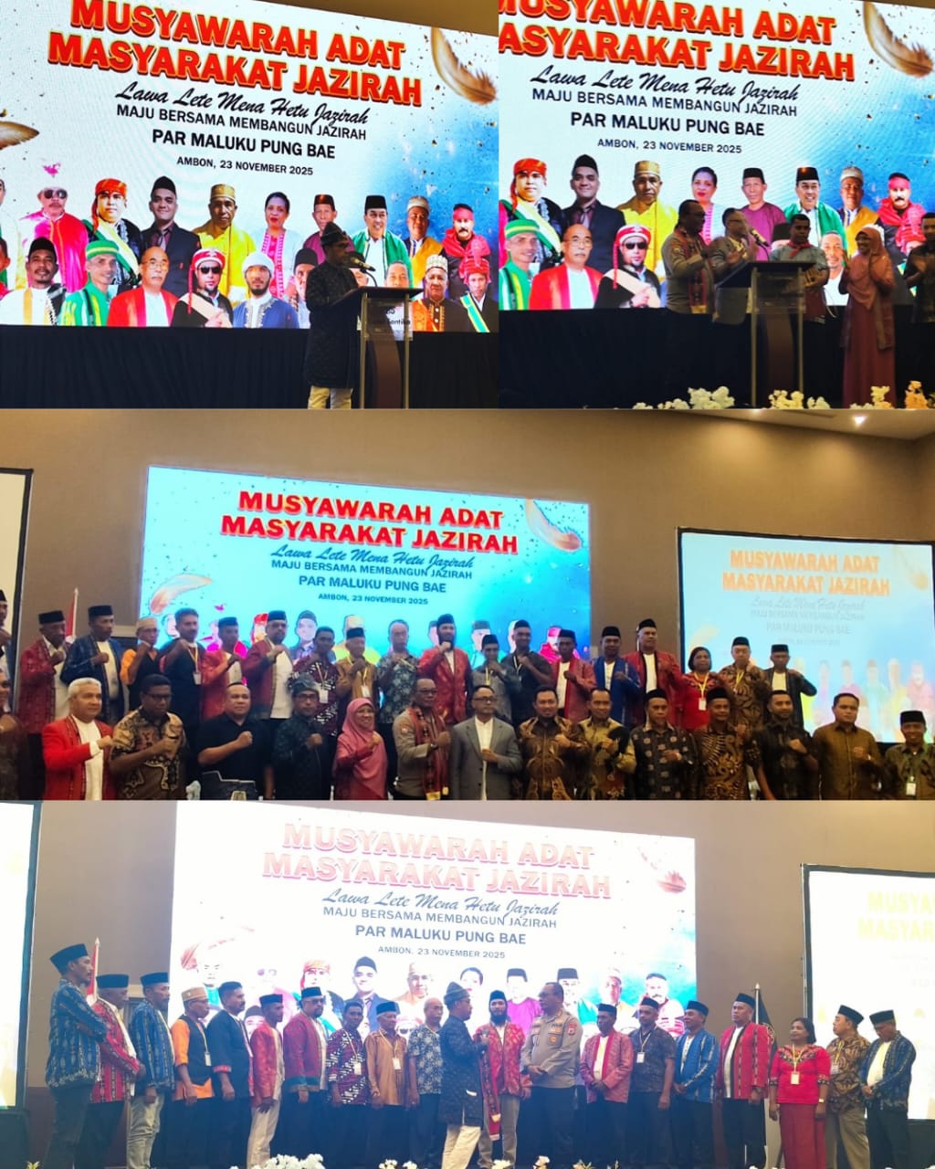 AMBON, — Kekuatan adat dan persaudaraan masyarakat Jazirah kembali diteguhkan lewat Musyawarah Adat Hetu Jazirah bertema “Lawa Lete Mena Hetu Jazirah – Maju Berama Membangun Jazirah par Maluku pung Bae”, yang berlangsung di Hotel Santika Ambon, Minggu (23/11/25).