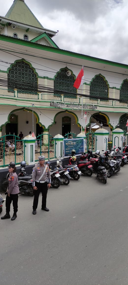 Polresta Ambon- Satuan Lalu Lintas Polresta Pulau Ambon dan Pulau-Pulau Lease melaksanakan pengamanan pelaksanaan Shalat Jumat di sejumlah titik pusat keramaian, Jumat siang (8/8).