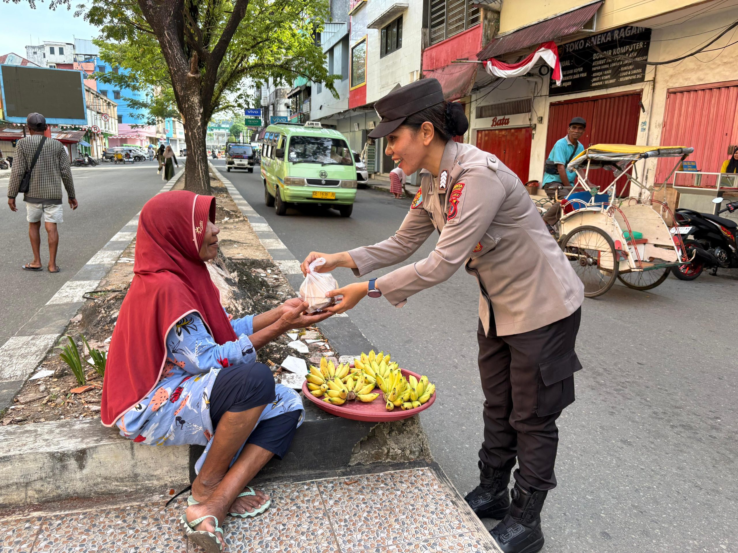 Dalam kesempatan tersebut, petugas membagikan 100 makanan siap santap kepada para petugas kebersihan, tukang becak, dan masyarakat yang sedang beraktivitas di sekitar lokasi. Bantuan sederhana ini diharapkan dapat meringankan kebutuhan harian mereka, sekaligus menjadi bentuk kedekatan Polri dengan warga yang bekerja di sektor informal.