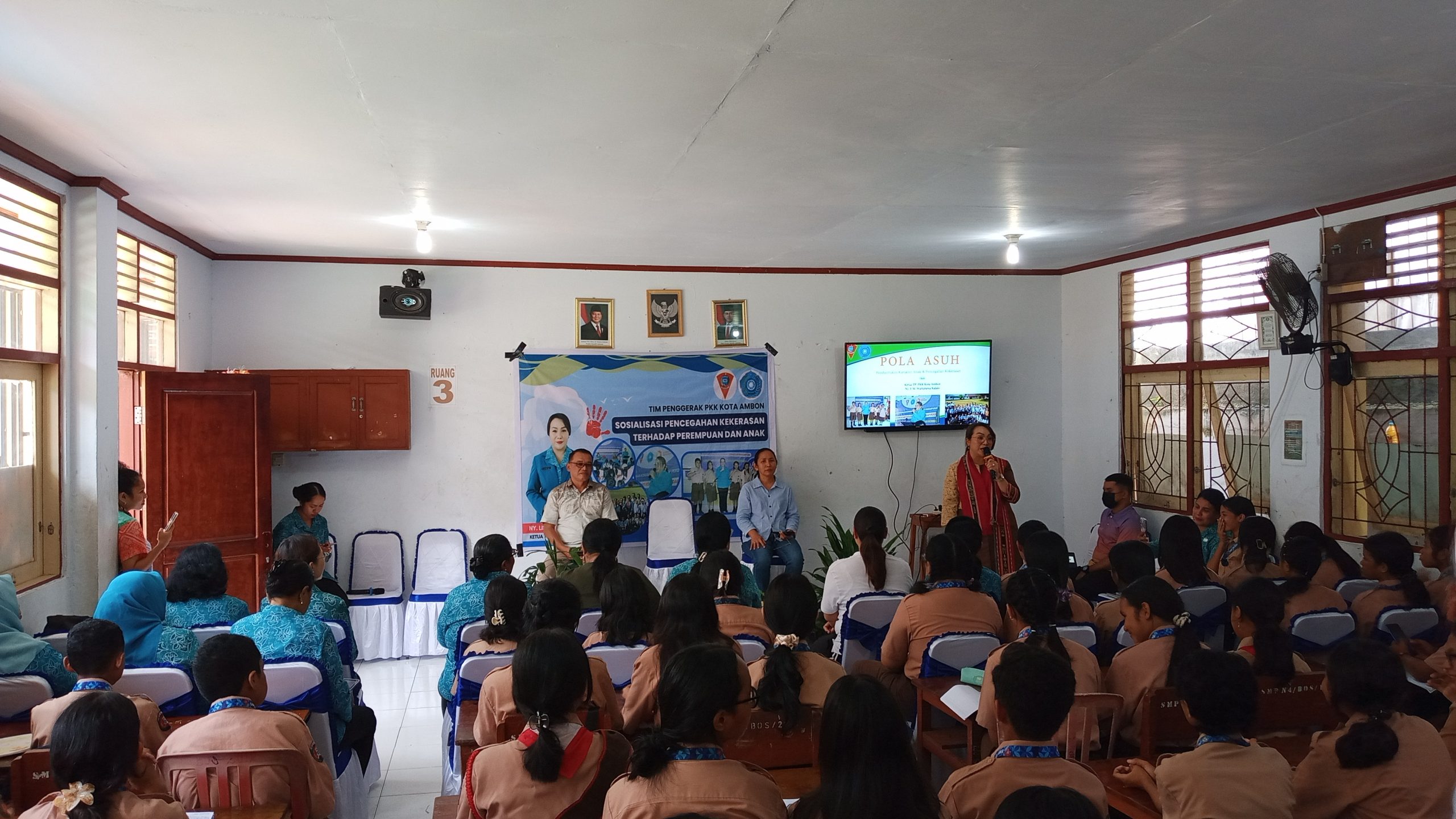 Kota Ambon,– Ketua Tim Penggerak PKK Kota Ambon, Lisa Wattimena, memberikan sambutan sekaligus menjadi pemateri dalam kegiatan sosialisasi pola pencegahan kekerasan terhadap perempuan dan anak yang digelar di SMP Negeri 4 Ambon, Kamis (08/08//2025).