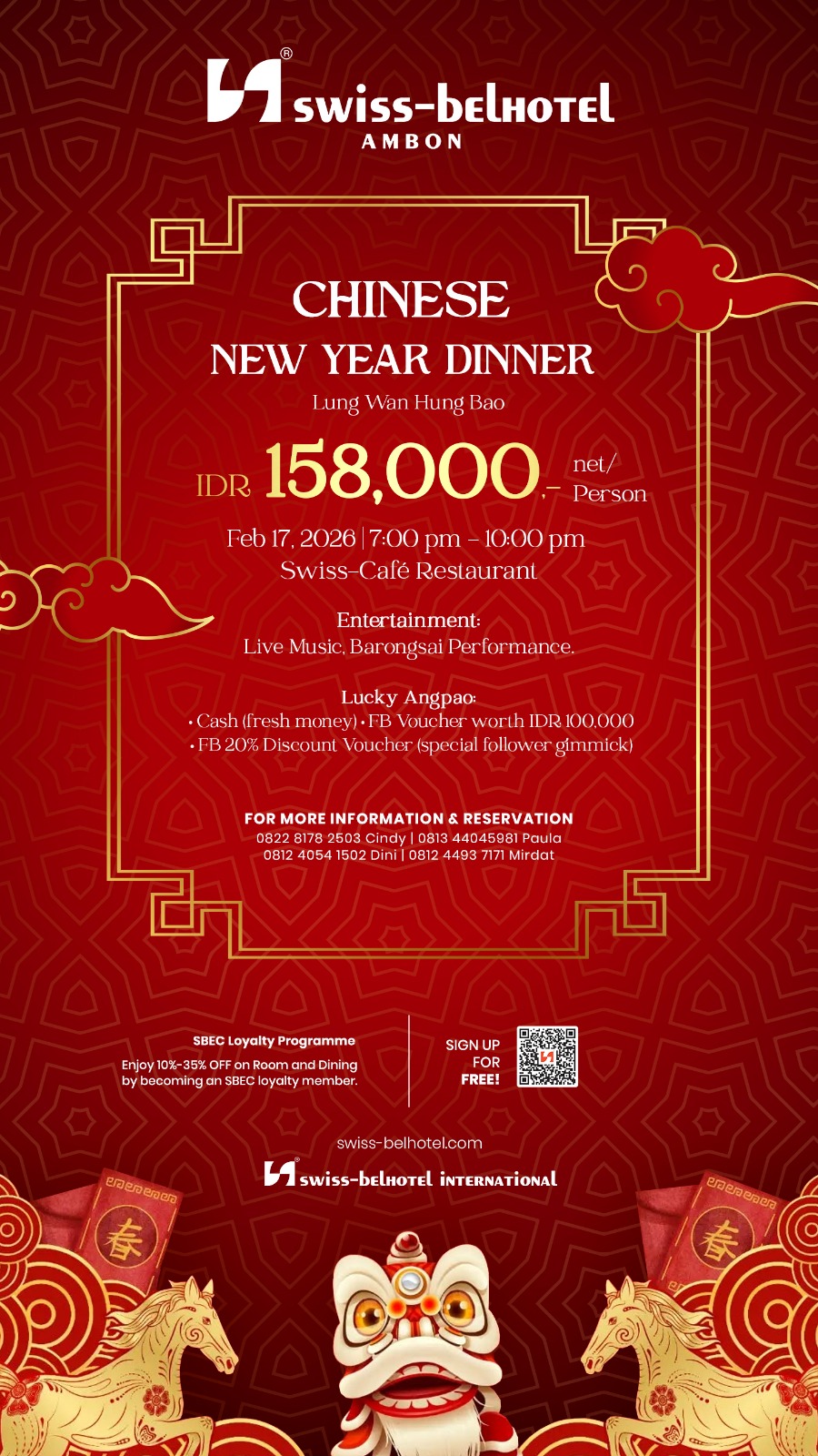 Dengan menggabungkan konsep kuliner tematik, hiburan budaya, serta berbagai program menarik, Swiss-Belhotel Ambon berharap Chinese New Year Eve Dinner 2026 ini dapat menjadi pilihan utama masyarakat Kota Ambon dan sekitarnya dalam merayakan Tahun Baru Imlek dengan suasana yang meriah, nyaman, dan sarat akan nilai kebersamaan,pungkasnya