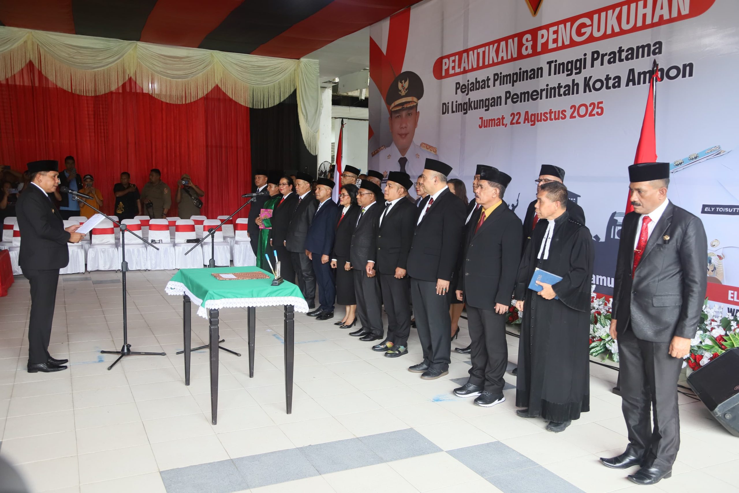 (Haleluya) Kota Ambon – Walikota Ambon Bodewin Watimena melantik dan mengukuhkan pejabat pimpinan tinggi Pratama di lingkup Pemerintah Kota Ambon. Acara ini dihadiri oleh berbagai pejabat dan tokoh masyarakat.Jumat(22/08/2025)